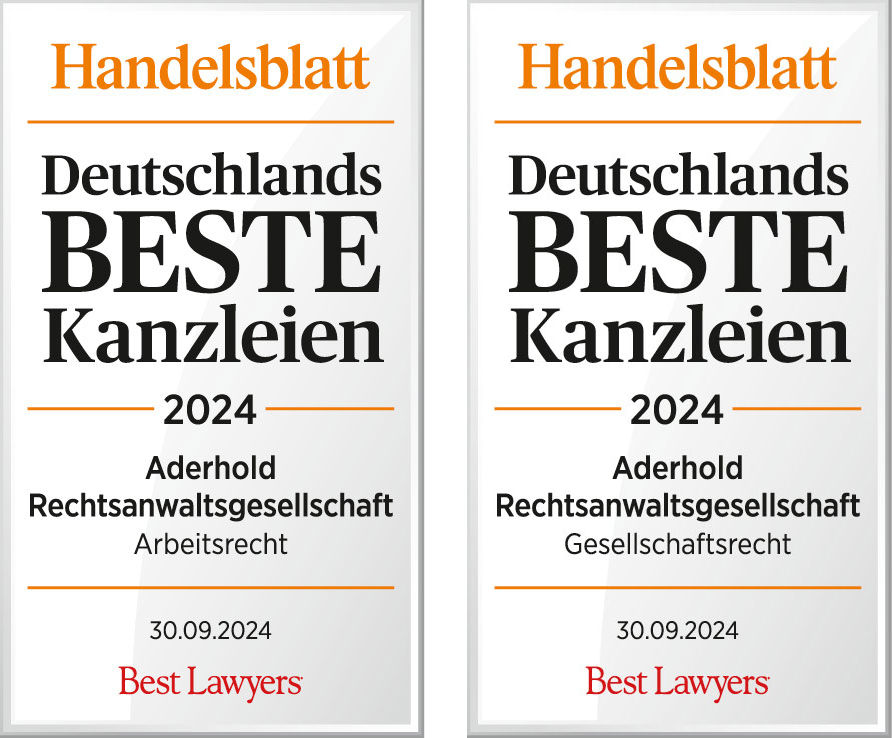 Die Aderhold Rechtsanwaltsgesellschaft mbH wurde im September 2024 als eine von „Deutschlands Beste Kanzleien 2024“ in den Rechtsbereichen Arbeits- und Gesellschaftsrecht gekürt.
