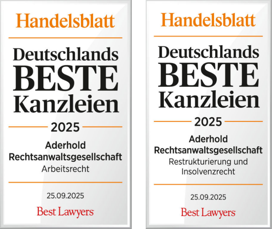 Die Aderhold Rechtsanwaltsgesellschaft mbH wurde im September 2025 als eine von „Deutschlands Beste Kanzleien 2025“ in den Rechtsbereichen Arbeitsrecht und Restrukturierung und Insolvenzrecht ausgezeichnet.