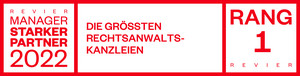 Die Wirtschaftszeitschrift Revier Manager hat die Aderhold Rechtsanwaltsgesellschaft mbH im Juni 2022 auf Platz 1 der größten Kanzleien im Ruhrgebiet gelistet und empfiehlt unsere Kanzlei als „Starken Partner 2022“. Maßgeblich dafür war der interdisziplinäre Beratungsansatz, welcher die spezialisierte juristische Expertise durch betriebswirtschaftliches Know-How erfolgreich ergänzt.