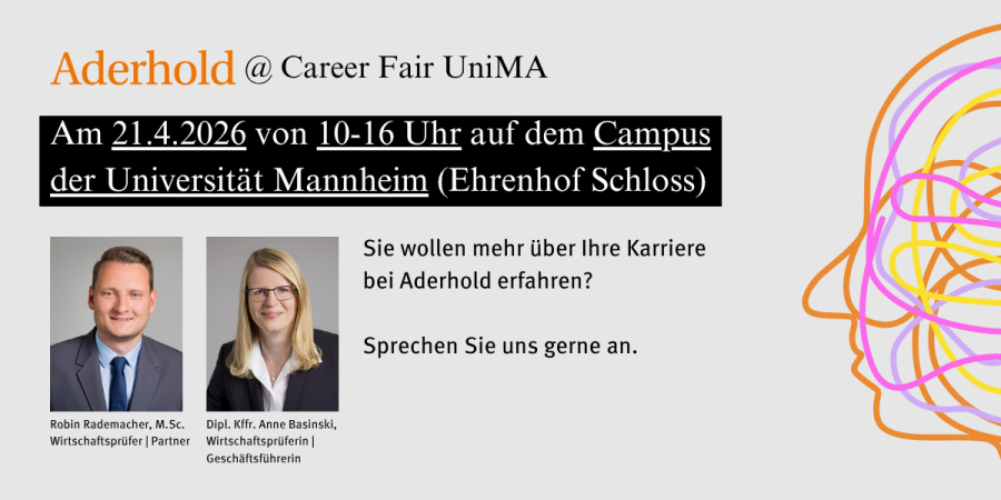 Am 21. April 2026 ist Aderhold auf der Career Fair der Universität Mannheim vertreten. Frau Anne Basinski und Herr Robin Rademacher stehen Ihnen vor Ort für persönliche Gespräche zur Verfügung — rund um das Thema Unternehmensrestrukturierung und die Perspektiven, die Aderhold Berufseinsteigenden wie erfahrenen Talenten bietet.