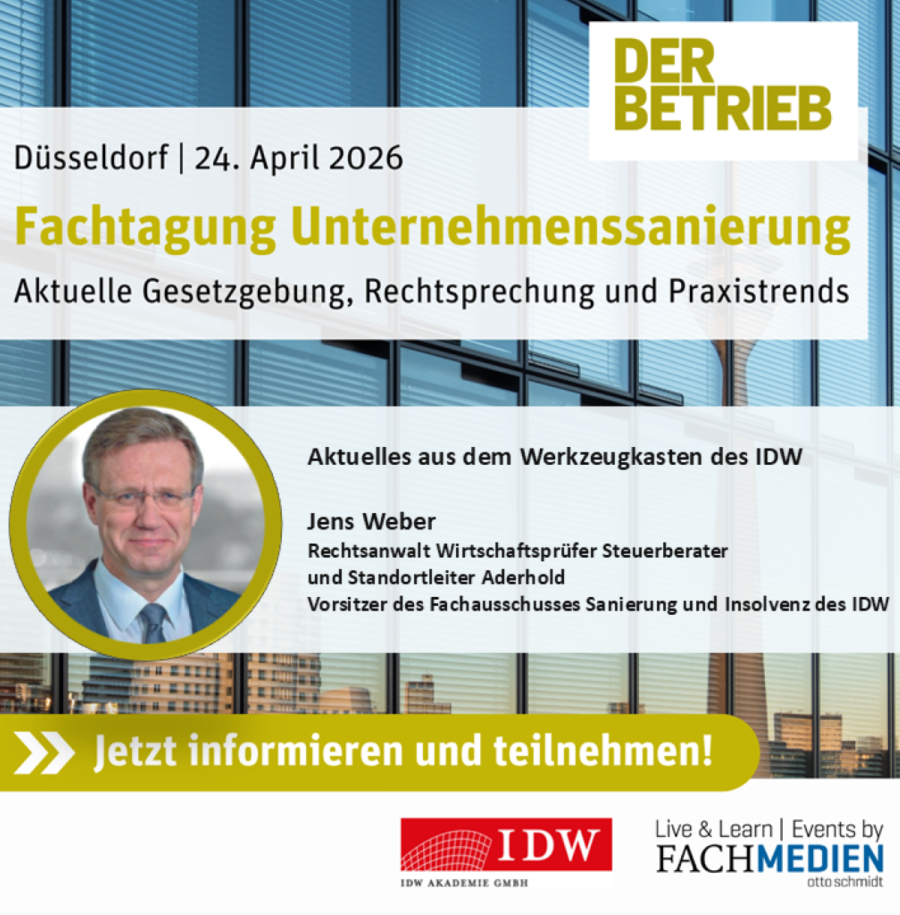 Als Vorsitzer des Fachausschusses Sanierung und Insolvenz des IDW (FAS) — des Gremiums, das die maßgeblichen Sanierungsstandards in Deutschland erarbeitet und weiterentwickelt —bringt Weber zudem unmittelbares Insiderwissen über den Stand der Standardentwicklung mit. Sein Vortrag auf der Fachtagung ist damit mehr als ein Praxisbericht: Er gibt Einblick in die Fragen, mit denen sich der Fachausschuss selbst beschäftigt.
